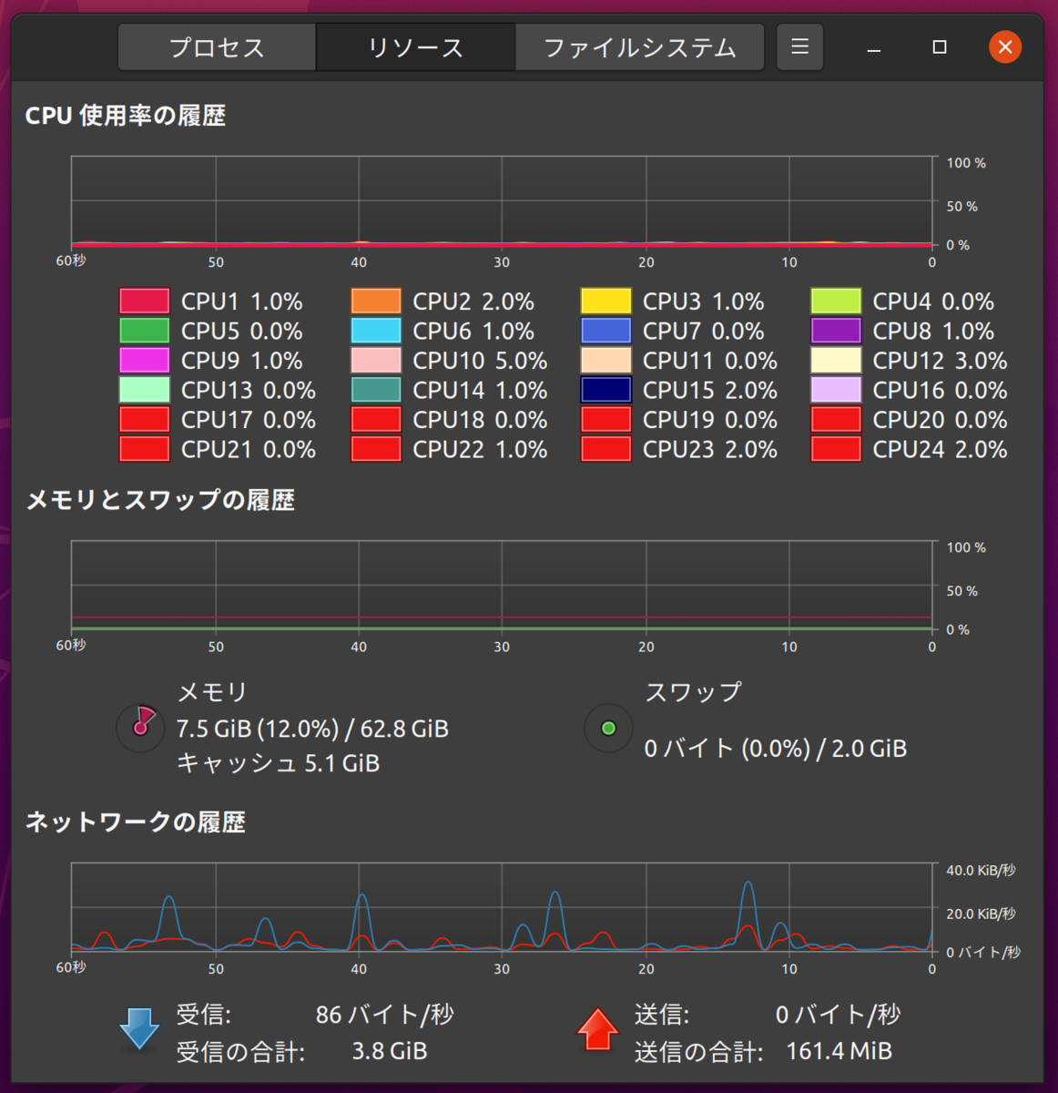 12コア24スレ、メモリ64GBなタスクマネージャーの様子。暇そうにしている。